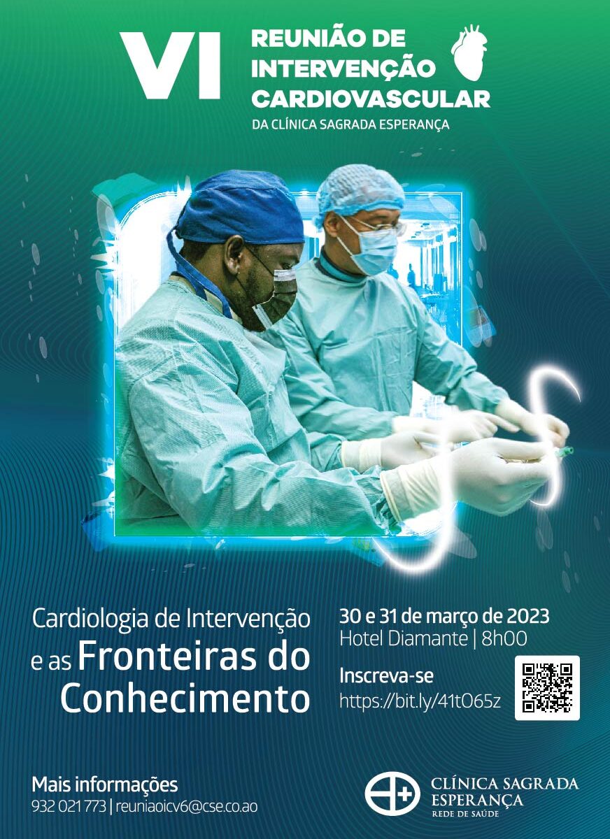 A Clínica Sagrada Esperança Realiza de 30 a 31 de Março as 8H , no hotel Diamante em Luanda, a 6º reunião de Intervenção Cardiovascular, sob o tema, “Cardiologia de Intervenção e as fronteiras do conhecimento”.