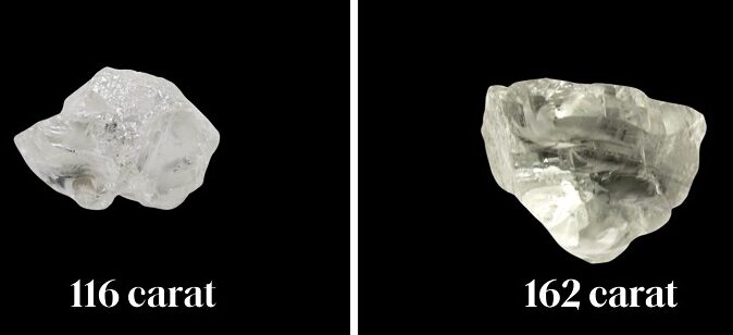 As duas pedras especiais (116 e 162 quilates) do tipo IIa foram recuperadas no Bloco Mineiro 46, e trata-se do 41.º e 42.º maiores diamantes de mais de 100 quilates a serem recuperados na referida mina, desde o início das operações em 2010.